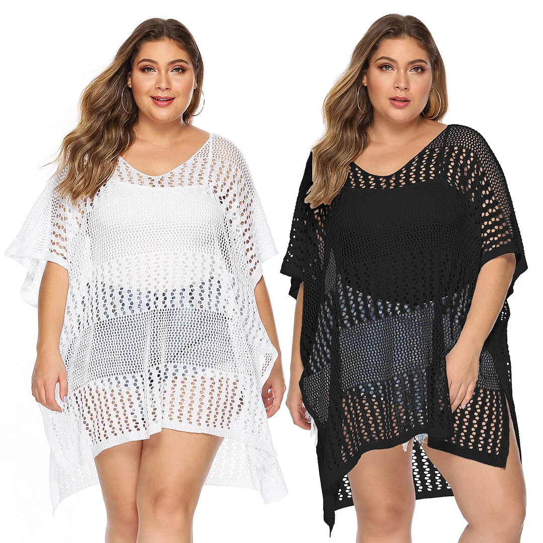 Beach Vacation Essential! EU/US Plus Size Women's Black Hollow-Woven Bikini Cover-Up | Sexy Loose & Irregular Slit, Perfect for Photos👙