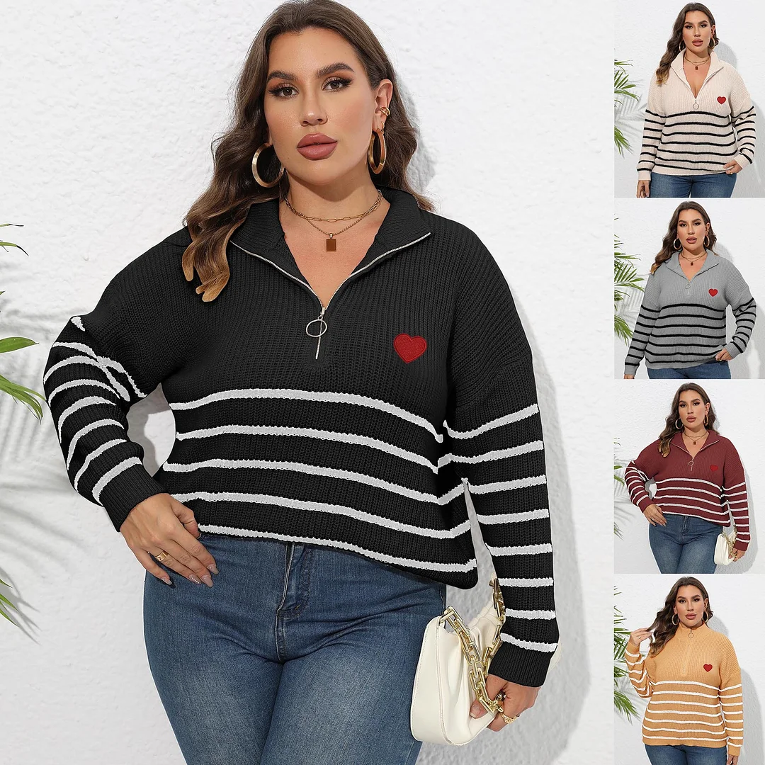 Autumn & Winter Stylish Pick! EU/US Plus Size Women's Black Stripe Spliced Half-Turtleneck Zipper Love-Jacquard Pullover Sweater👚