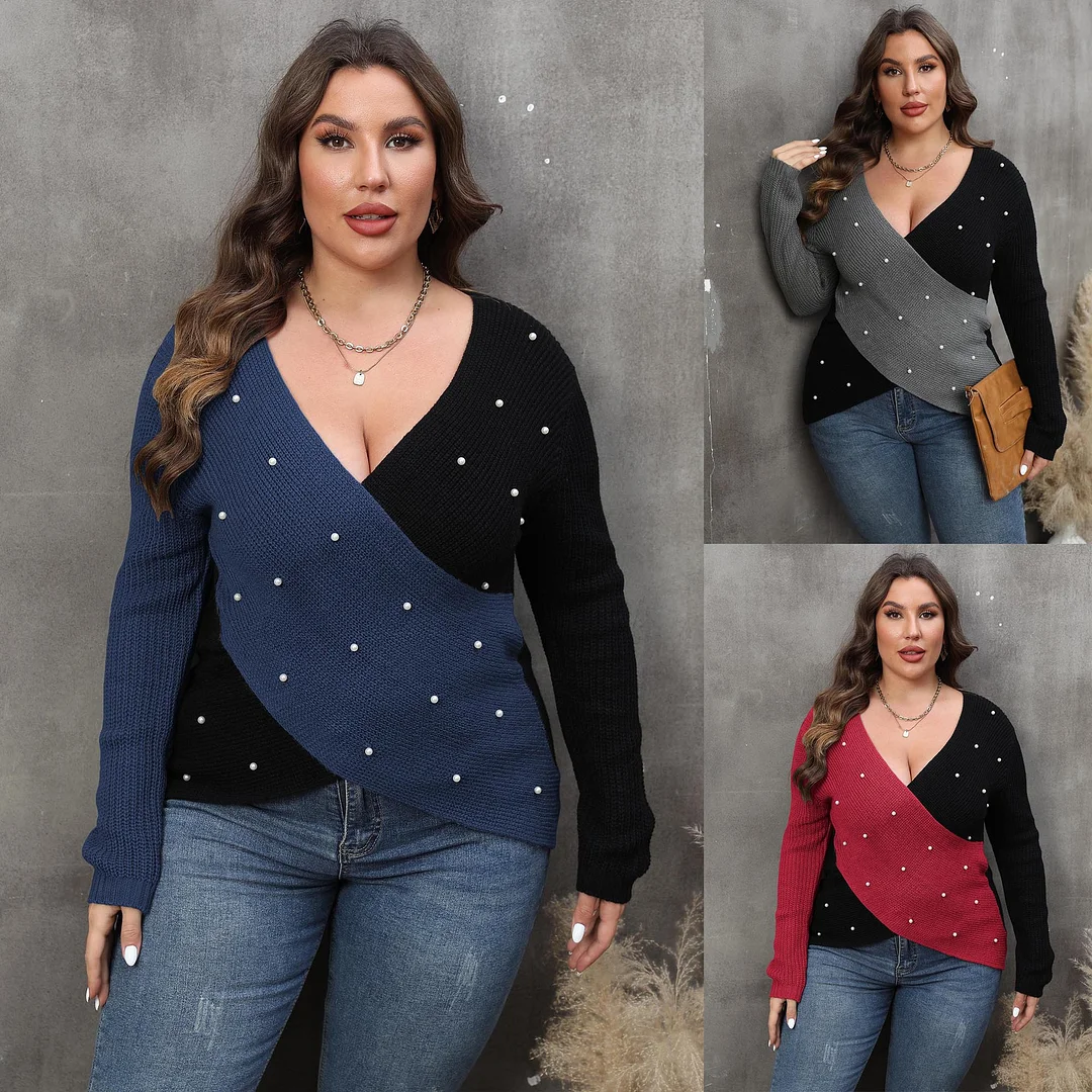 Autumn & Winter Eye-Catcher! EU/US Plus Size Women's Red Deep V Pearl Beaded Color-Block Sweater | Sexy & Skin-Whitening👚